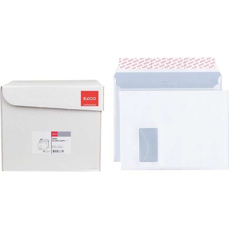 Enveloppes ELCO Documento avec soufflet, blanches kraft blanc, soufflet 20 mm, intérieur gris. Durabilité eco:plus: recyclable. Certification: FSC. C4, avec fermeture autoadhésive Optifix® 324 x 239 mm, façon DNS-HK. Boîte de 200 pièces.