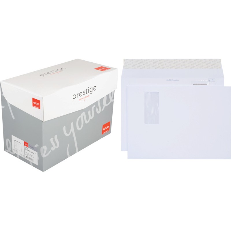 Enveloppes haut de gamme ELCO Prestige, emballage de bureau blanches, fond non imprimé. Durabilité eco:plus: recyclable. Certification: FSC. C4, avec fermeture autoadhésive Optifix® 324 x 229 mm, façon DNG-HK. Boîte de 200 pièces.