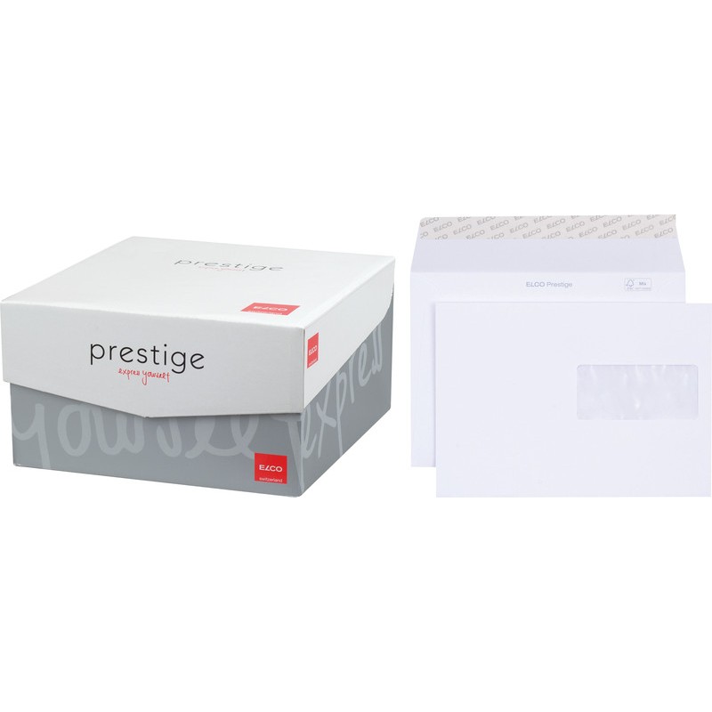 Enveloppes haut de gamme ELCO Prestige, emballage de bureau blanches, fond non imprimé. Durabilité eco:plus: recyclable. Certification: FSC. C5, avec fermeture autoadhésive Optifix® 229 x 162 mm, façon DNG-HK. Boîte de 250 pièces.