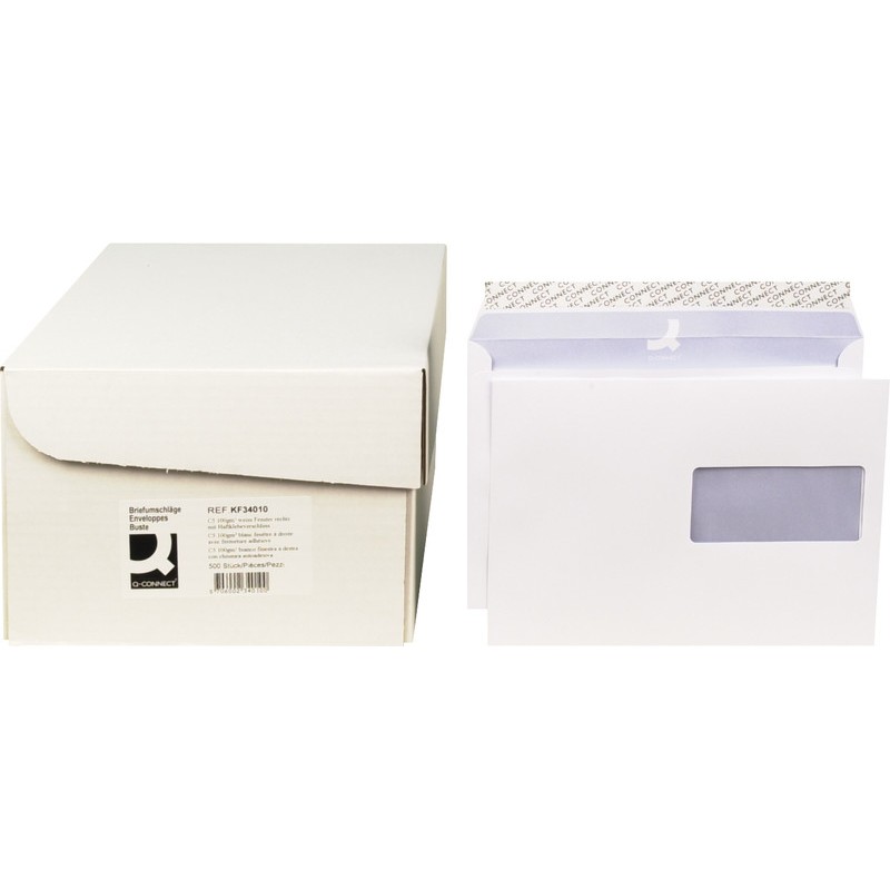 Enveloppes Q-CONNECT®, emballage de bureau blanches, sans chlore élémentaire, intérieur gris, couleur 100% à base d'eau. C5, avec fermeture autoadhésive 229 x 162 mm, façon DNG-HK. Boîte de 500 pièces.