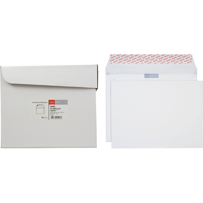 Enveloppes ELCO Power, emballage de bureau indéchirables et sûres pour l'envoi de documents confidentiels, lourds, à arêtes vives et de valeur, blanches, qualité suisse, sans chlore élémentaire, opacité absolue, parfaite aptitude à l'impression, faible poids à vide. Durabilité eco:plus: recyclable. Certification: FSC. C4 plus, avec soufflet, avec fermeture autoadhésive Optifix® 324 x 239 x 20 mm, façon DNG-HK. Boîte de 200 pièces.