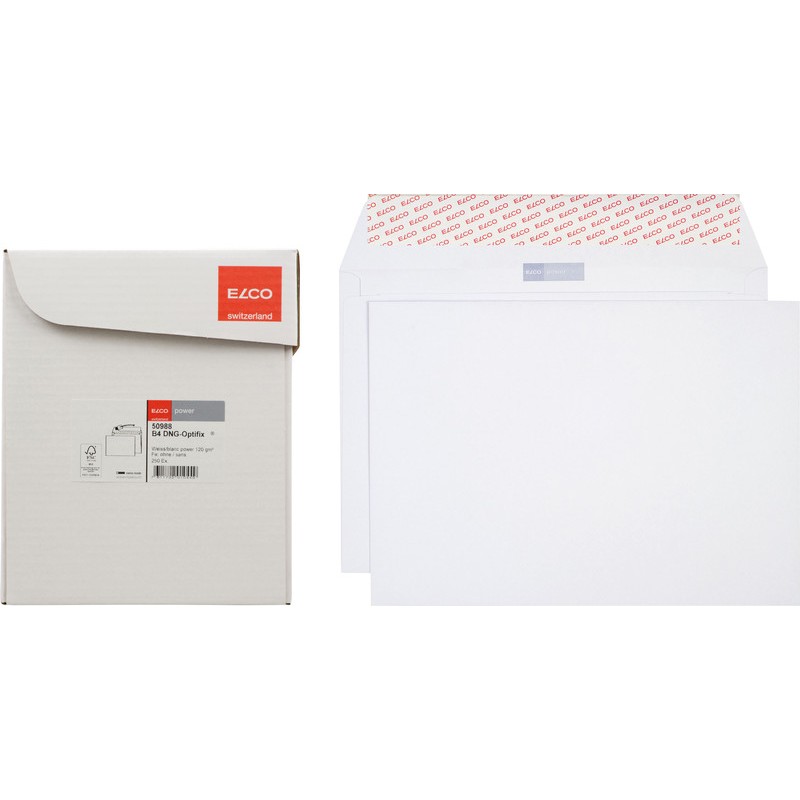 Enveloppes ELCO Power, emballage de bureau indéchirables et sûres pour l'envoi de documents confidentiels, lourds, à arêtes vives et de valeur, blanches, qualité suisse, sans chlore élémentaire, opacité absolue, parfaite aptitude à l'impression, faible poids à vide. Durabilité eco:plus: recyclable. Certification: FSC. B4, avec fermeture autoadhésive Optifix® 353 x 250 mm, façon DNG-HK. Boîte de 250 pièces.
