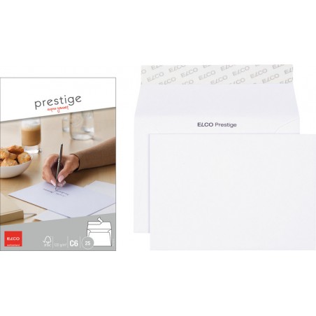 Enveloppes haut de gamme ELCO Prestige, petit emballage blanches, fond non imprimé. Durabilité eco:plus: recyclable. Certification: FSC. C6, avec fermeture autoadhésive 162 x 114 mm, façon DNG-HK. Cello-zip de 25 pièces.