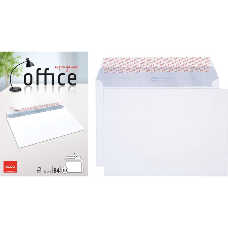 Enveloppes ELCO Office, petit emballage qualité premium extra-blanche, sans chlore, intérieur gris, couleur 100% à base d'eau. Durabilité eco:plus: recyclable. Certification: FSC. B4, avec fermeture autoadhésive Optifix® 353 x 250 mm, façon DNG-HK. Cello-zip de 10 pièces.