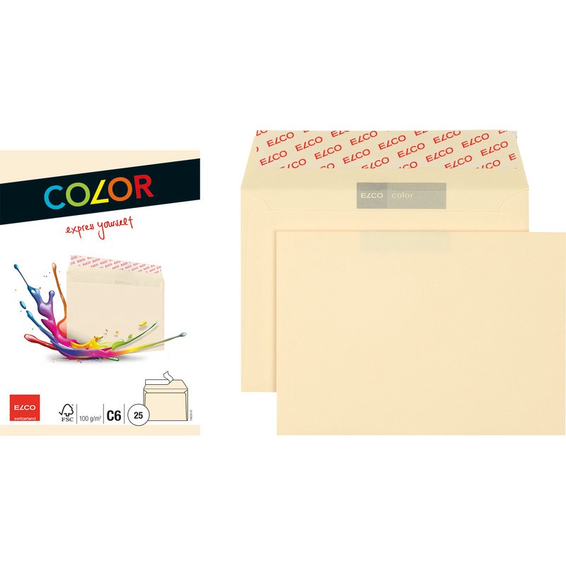 Enveloppes ELCO Color, petit emballage en couleur, sans chlore élémentaire. Durabilité eco:plus: recyclable. Certification: FSC. C6, avec fermeture autoadhésive Optifix®, par couleur 162 x 114 mm, façon DNG-HK. Cello-zip de 25 pièces.