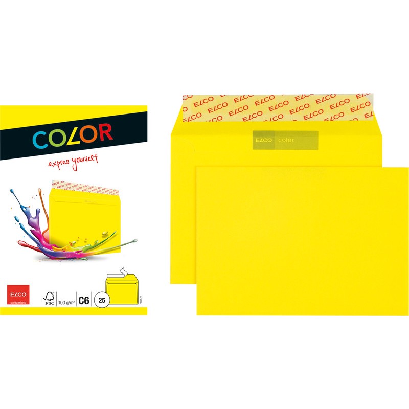 Enveloppes ELCO Color, petit emballage en couleur, sans chlore élémentaire. Durabilité eco:plus: recyclable. Certification: FSC. C6, avec fermeture autoadhésive Optifix®, par couleur 162 x 114 mm, façon DNG-HK. Cello-zip de 25 pièces.