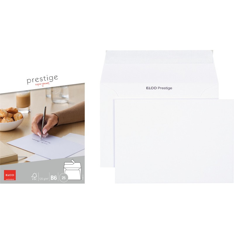 Enveloppes haut de gamme ELCO Prestige, petit emballage blanches, fond non imprimé. Durabilité eco:plus: recyclable. Certification: FSC. B6, avec fermeture autoadhésive 176 x 125 mm, façon DNG-HK. Cello-zip de 25 pièces.