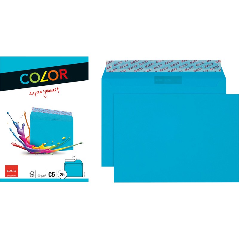 Enveloppes ELCO Color, petit emballage en couleur, sans chlore élémentaire. Durabilité eco:plus: recyclable. Certification: FSC. C5, avec fermeture autoadhésive Optifix®, par couleur 229 x 162 mm, façon DNG-HK. Cello-zip de 25 pièces.