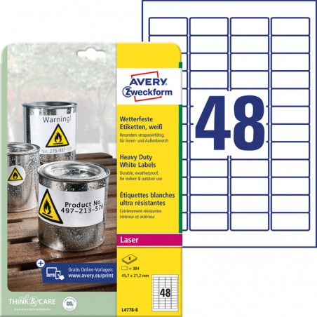 Etiquettes résistantes aux intempéries AVERY® ZWECKFORM étiquettes adhésives en film PES blanc sur feuilles DIN A4, déperlantes, résistantes à l'huile, aux salissures et aux températures de -40 à +150°C. Pour copieurs, imprimantes laser, laser couleur et copieurs couleur, inscription facile avec le concepteur d'étiquettes en ligne gratuit sur www.avery.eu/print. emballage de 8 feuilles