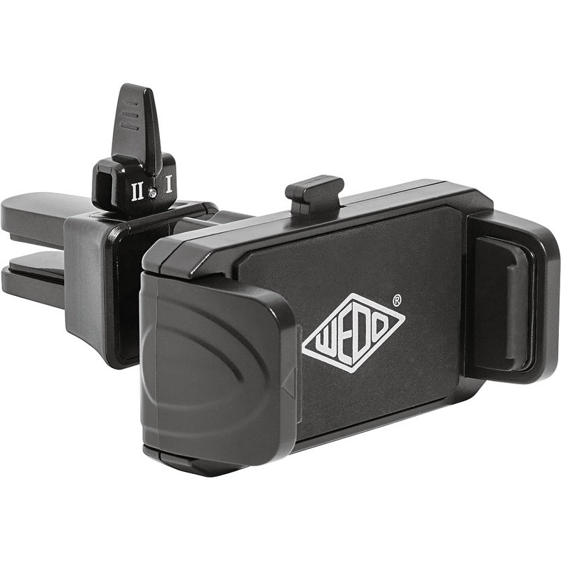 Support de fixation pour smartphone WEDO® Clip-It plus la fixation caoutchoutée avec levier de verrouillage réglable sur 2 positions (1,5 - 2,5 mm et 2,5 - 3,5 mm) s'adapte à l'épaisseur des lamelles de ventilation de la voiture, avec articulation pivotante à 360° pour un champ visuel optimal, les attaches Soft-Touch avec mécanisme à ressort maintiennent les smartphones d'une largeur de 55 à 85 mm, une pression sur le bouton Quick-out et le support se libère. Dimensions: L 73 x H 91 mm.