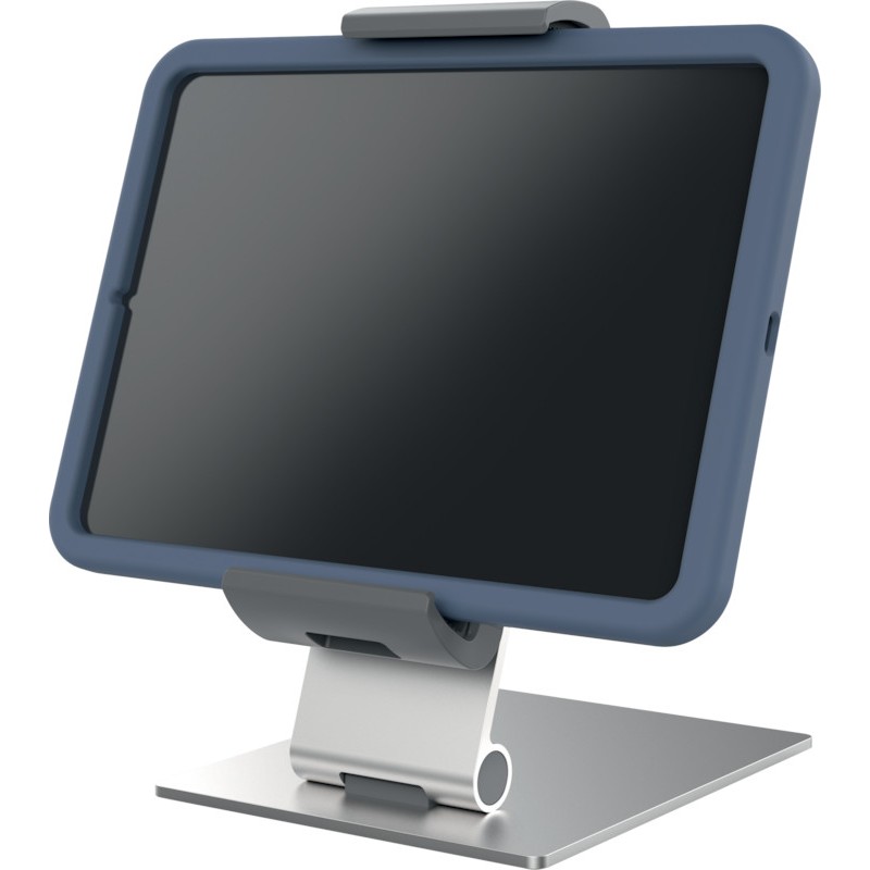 Support pour tablette DURABLE Table XL en aluminium, acier et plastique de grande qualité, réglage individuel et en continu de l'angle de lecture de 0° à +88°, pivote sur 360°, lignes élégantes et épurées avec des surfaces à finition satinée, pour tablettes avec housse de protection, utilisation de la tablette au format portrait ou paysage, avec points d'arrêt à 90°, ouverture latérale pour câble, tous les ports accessibles, utilisation facile à une main, module d'insertion variable pour tous les formats de tablette de 7 - 13', protection antivol supplémentaire par serrure à câble (câble non fourni), ouverture symétrique de 160 - 275 mm, les surfaces de pose et de maintien caoutchoutées protègent la tablette d'un endommagement, grande stabilité. Dimensions: L 155 x H 242 x P 183 mm. argent métallisé