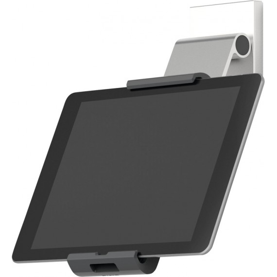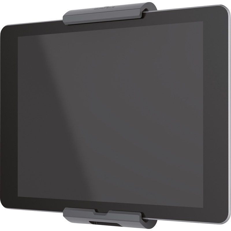 Support pour tablette DURABLE mural en aluminium et plastique de grande qualité, lignes élégantes et épurées avec des surfaces à finition satinée, fixation murale robuste, fixation sûre et plate, utilisation universelle et flexible, pivote sur 360°, utilisation de la tablette au format portrait ou paysage, avec points d'arrêt à 90°, montage facile, ouverture latérale pour câble, support élégant, dispositif anti-vol par le blocage des bras de maintien, utilisation facile à une main, pour tous les formats de tablette de 7 - 13', les surfaces de pose et de maintien caoutchoutées protègent la tablette d'un endommagement. Dimensions: L 85 x H 180 x P 50 mm. argent métallisé