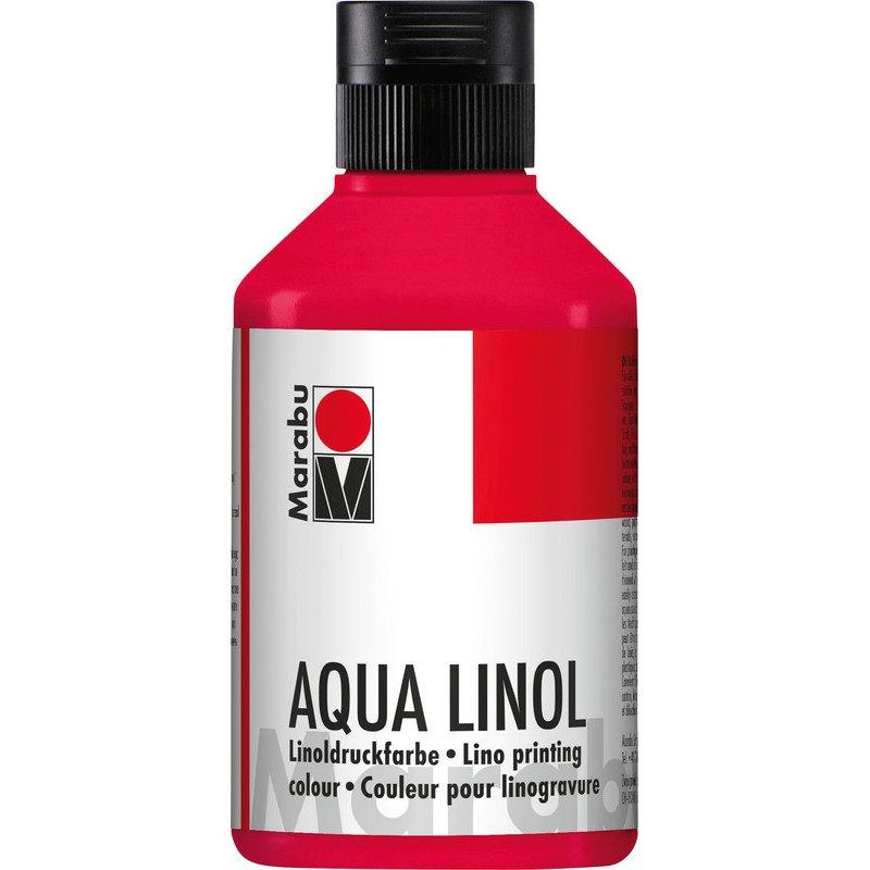 Peinture pour linogravure MARABU Aqua à base d'eau, épaisse, convient pour toutes les techniques de gravure en relief, idéale pour les écoles, les loisirs créatifs, les arts graphiques, les métiers artistiques et les activités thérapeutiques, pour l'impression sur différents supports tels que papier japon, carton, tissu, feutre, etc., l'encrage peut être réalisé sur linoléum, bois, polystyrène expansé, liège, matières plastiques, matières naturelles, etc., contenu 250 ml. Durabilité eco:plus: recyclable.