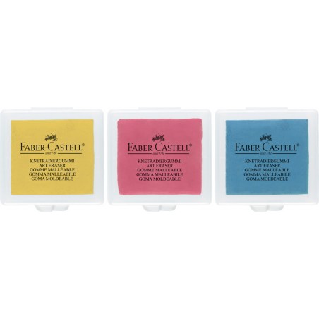 Gomme mie de pain FABER CASTELL Art Eraser facilement déformable et absorbante, pour corriger et éclaircir les dessins au fusain et au pastel, mais aussi pour le nettoyage des films plastique et des esquisses, sans PVC, dans une boîte transparente. Dimensions: L 38 x H 8 x P 35 mm.