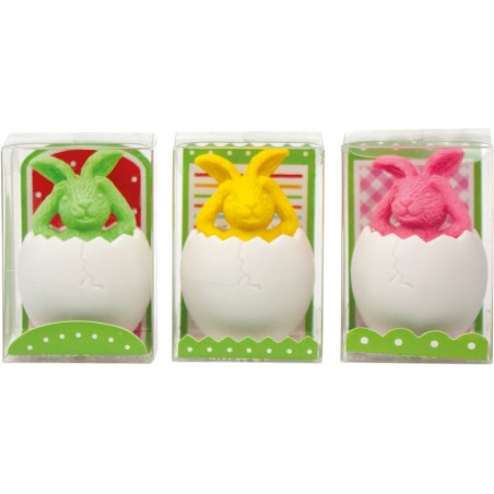 Gomme TRENDHAUS® lapin dans un oeuf couleurs assorties, vert, jaune et rose vif. Dimensions: L 36 x H 52 x P 36 mm.