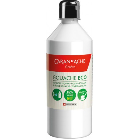 Gouache liquide CARAN D'ACHE Eco couleur résistante à la lumière, 80% à base de composants naturels (excepté les couleurs néon), soluble à l'eau, fort pouvoir couvrant même si diluée dans cinq parts d'eau, capuchon de dosage pour un dosage précis et économique, utilisable sur le papier, carton, bois, verre, métal, la pâte à sel, etc., s'enlève à l'eau savonneuse sur les mains, sols et tables, flacon en PET sans BPA ni phtalates. Flacon de 500 ml. Dimensions: H 205 mm, Ø 68 mm.