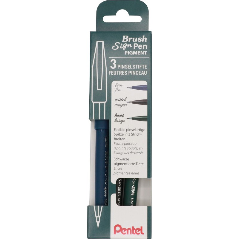 Feutre pinceau PENTEL Sign Pen Brush Pigment pointe pinceau, capuchon avec clip, encre résistante à la lumière et à l'eau, idéal pour les croquis, dessins, calligraphies et illustrations, non rechargeable. Durabilité eco:plus: composant recyclé, teneur en déchets recyclés avant utilisation max. 82%.