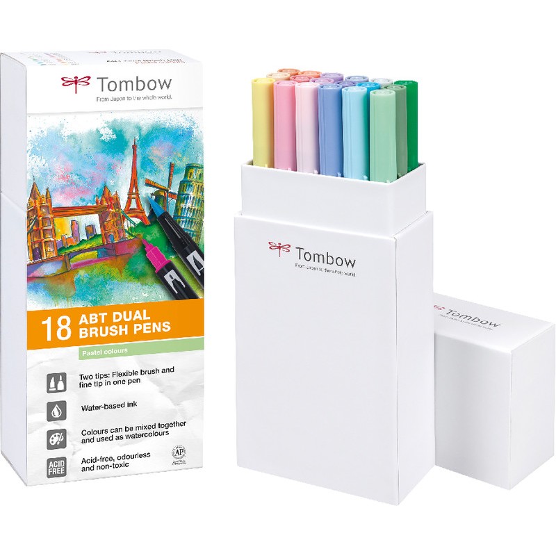 TOMBOW® ABT Dual Brush Pen assortis pointe résistante en nylon 3 - 10 mm, corps en matière plastique, feutre à 2 fonctions, avec une pointe fine 0,3 mm pour les lignes précises et une pointe pinceau conçue pour les traits fins, larges et les surfaces pleines, grand réservoir d'encre pour teinte identique aux deux pointes, encre à base d'eau, capuchon dans la couleur de l'encre, non rechargeable. Durabilité eco:plus: emballage respectueux de l'environnement.