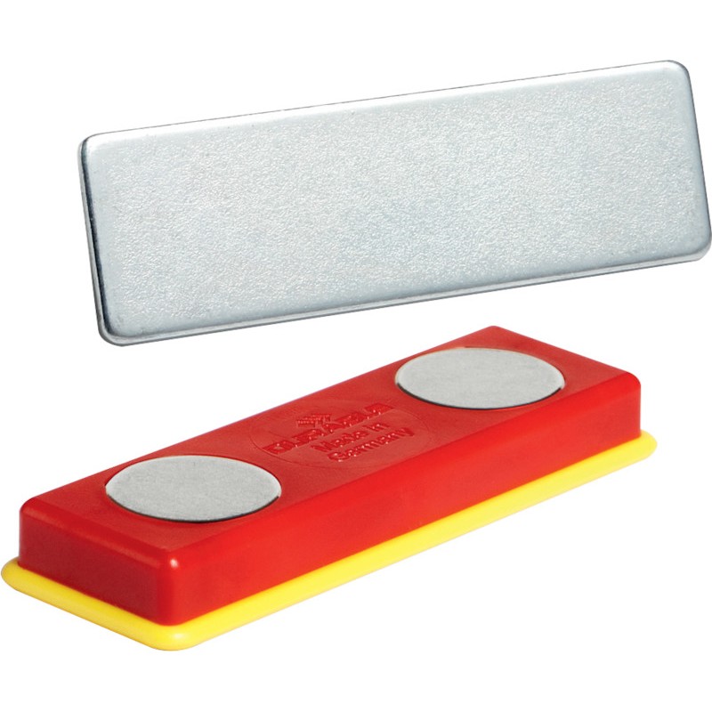 Attaches double aimant DURABLE Duracard bande adhésive pour une fixation sûre des plaquettes en métal sur les badges ou cartes plastiques, 2 points magnétiques maintiennent les cartes plastiques en place, conviennent pour les cartes plastiques DURABLE Duracard. Dimensions: L 40 x H 13 x P 7 mm. Emballage de 10 attaches double aimant. Durabilité eco:plus: composant recyclé, teneur en déchets recyclés après utilisation max. 10%.
