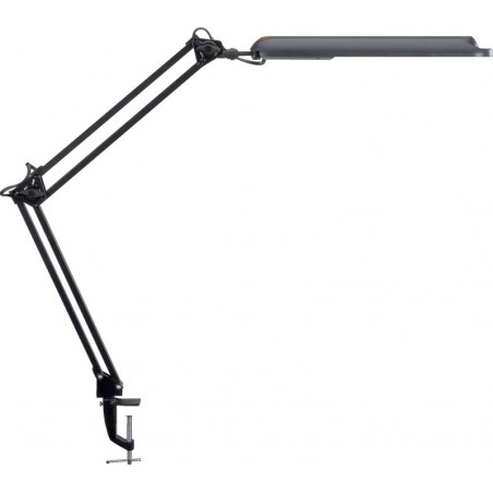 Lampe de bureau LED MAUL atlantic avec pince de fixation en métal tête allongée en plastique, bras filigrane en forme de parallélogramme, interrupteur sur la tête, réflecteur pour une répartition optimale de l'éclairage, consommation nulle à l'arrêt, 21 LED intégrées, les ampoules LED ne peuvent pas être remplacées, durée de vie moyenne des diodes env. 20'000 h, consommation d'énergie 9 kWh / 1000 h, 5800 kelvins (blanc lumière du jour), longueur des bras inférieur 330 mm et supérieur 340 mm, hauteur en position normale de travail 420 mm, pince de fixation en métal, ouverture max. 55 mm, classe de protection II, intensité lumineuse supérieure à 2000 lux (mesurée à 350 mm au-dessus de la surface de travail), Classe d'efficacité énergétique A, livrée démontée avec les instructions de montage. Certification: Intertek GS. Prix incluant la TAR. noir