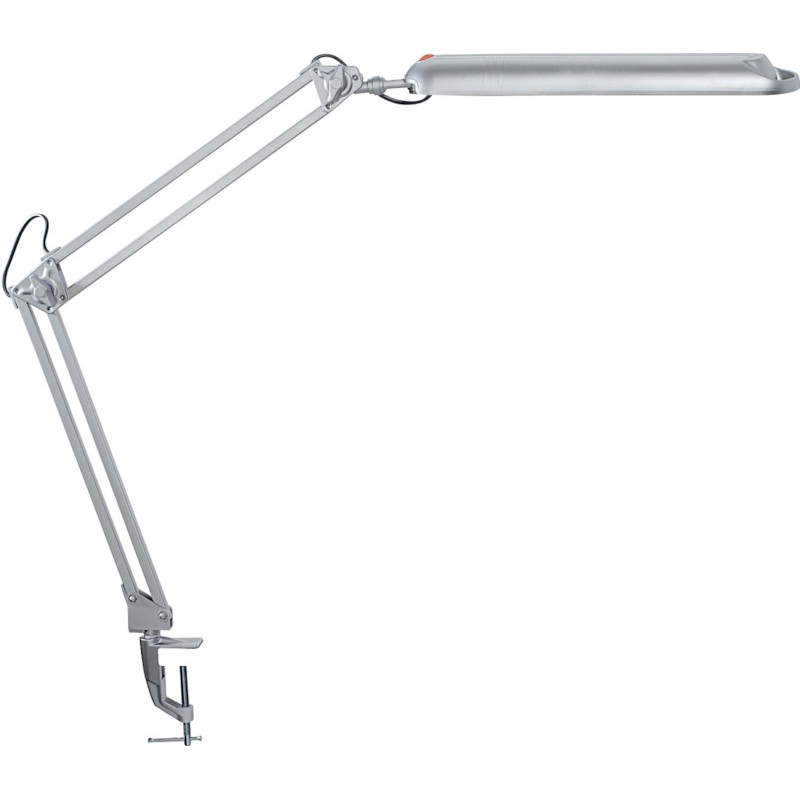 Lampe de bureau LED MAUL atlantic avec pince de fixation en métal tête allongée en plastique, bras filigrane en forme de parallélogramme, interrupteur sur la tête, réflecteur pour une répartition optimale de l'éclairage, consommation nulle à l'arrêt, 21 LED intégrées, les ampoules LED ne peuvent pas être remplacées, durée de vie moyenne des diodes env. 20'000 h, consommation d'énergie 9 kWh / 1000 h, 5800 kelvins (blanc lumière du jour), longueur des bras inférieur 330 mm et supérieur 340 mm, hauteur en position normale de travail 420 mm, pince de fixation en métal, ouverture max. 55 mm, classe de protection II, intensité lumineuse supérieure à 2000 lux (mesurée à 350 mm au-dessus de la surface de travail), Classe d'efficacité énergétique A, livrée démontée avec les instructions de montage. Certification: Intertek GS. Prix incluant la TAR. argent