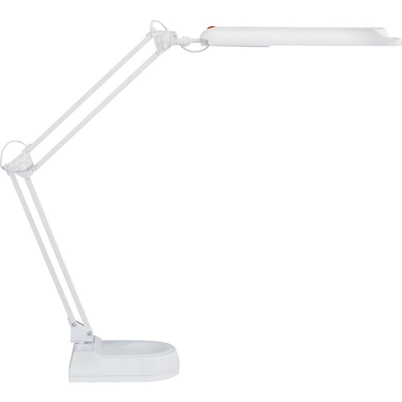 Lampe de bureau LED MAUL atlantic avec socle tête allongée en plastique, bras filigrane en forme de parallélogramme, interrupteur sur la tête, réflecteur assurant un éclairage optimal, consommation nulle à l'arrêt, 21 LED intégrées, les ampoules LED ne peuvent pas être remplacées, durée de vie moyenne des diodes env. 20'000 h, consommation d'énergie 9 kWh / 1000 h, 5800 kelvins (blanc lumière du jour), longueur des bras inférieur 330 mm et supérieur 340 mm, hauteur en position normale de travail 450 mm, socle lesté, classe de protection II, intensité lumineuse supérieure à 2000 lux (mesurée à 350 mm au-dessus de la surface de travail), classe d'efficacité énergétique A, livrée démontée avec les instructions de montage. Certification: Intertek GS. Prix incluant la TAR. blanc