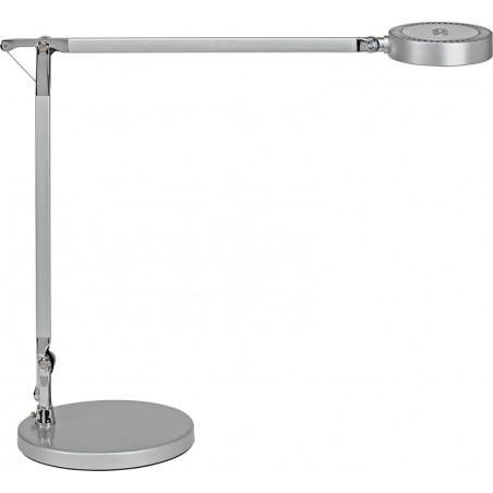 Lampe de bureau LED MAUL grace réglable bras en aluminium brossé et anodisé, tête de lampe orientable et inclinable, température de couleur réglable en continu et intensité lumineuse réglable sur 4 niveaux, réglage par zone tactile sur la tête, 48 LED intégrées, les LED ne peuvent pas être remplacées, durée de vie moyenne des LED env. 20'000 h, consommation d'énergie 6 kWh / 1000 h, 3000 - 6500 kelvins (blanc chaud - blanc lumière du jour), longueur du bras supérieur et inférieur 365 mm, hauteur en position normale de travail 440 mm, socle solide avec ballast et couche de protection des surfaces sur le dessous, intensité lumineuse 1400 lux (mesurée à 350 mm au-dessus de la surface de travail), classe d'efficacité énergétique A, livrée montée. Prix incluant la TAR. argent