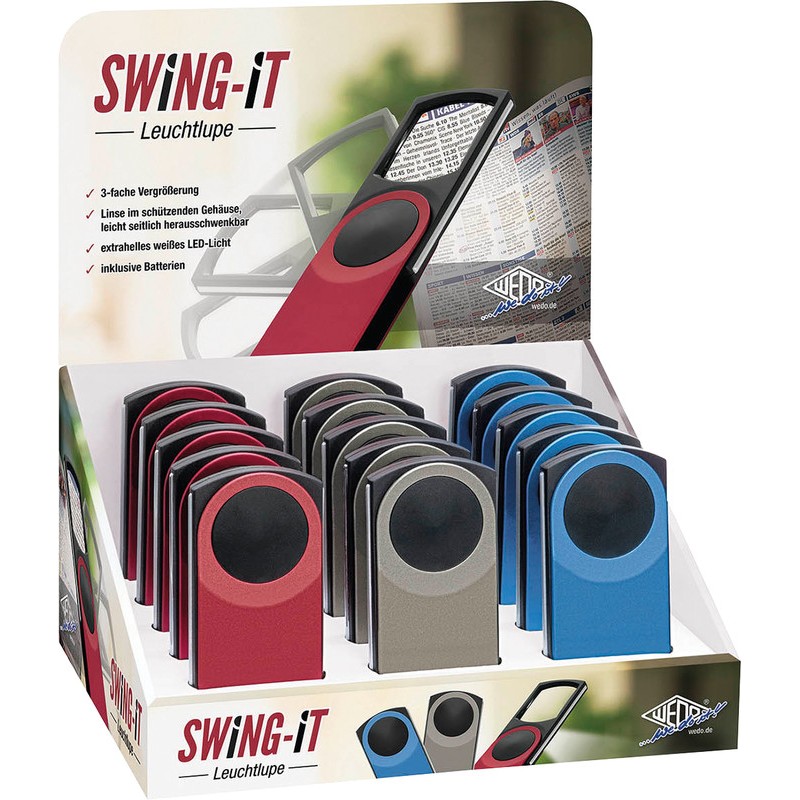 Loupe éclairante WEDO® Swing-It en ABS, la lampe à LED blanche à forte luminosité s'allume par pivotement de la lentille sur le côté, lentille en matière synthétique L 48 x H 38 mm, grossit 3 fois, livrée avec 2 piles 3 V (CR2016), couleurs assorties, argent, bleu métallisé et rouge métallisé. Dimensions: L 50 x H 112 x P 13 mm. Poids: 52 g. Prix incluant la TEA.