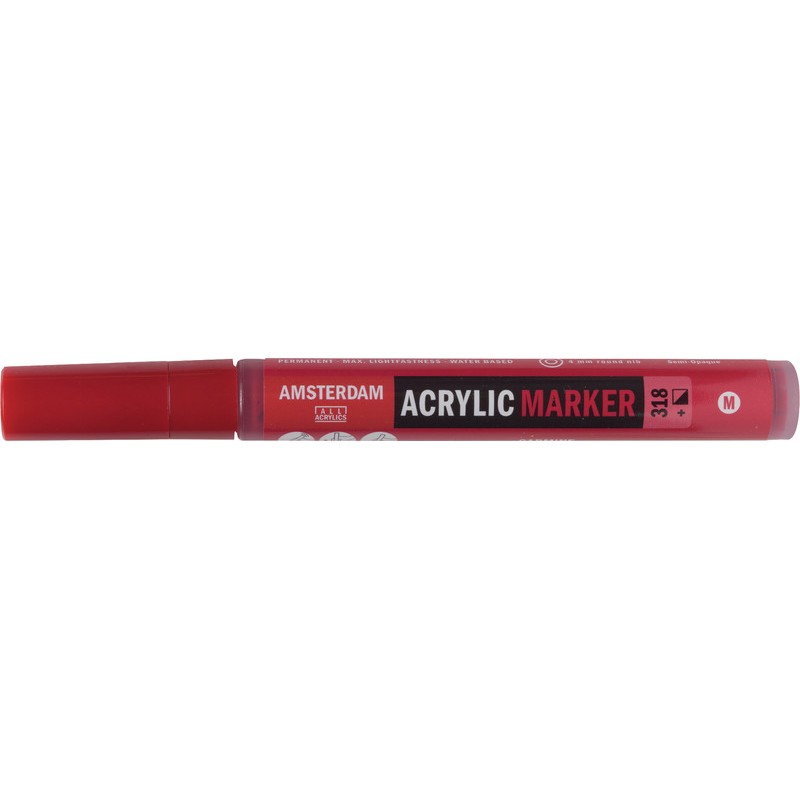 Marqueur acrylique AMSTERDAM pointe ogive, couleur brillante à base d'eau, très grande résistance à la lumière, parfait pour esquisser, peindre ou écrire sur un grand nombre de supports acryliques, p. ex. sur les châssis entoilés, le bois ou la terre cuite, séchage rapide, résistant à l'eau après séchage, non rechargeable, largeur de trait env. 4 mm.