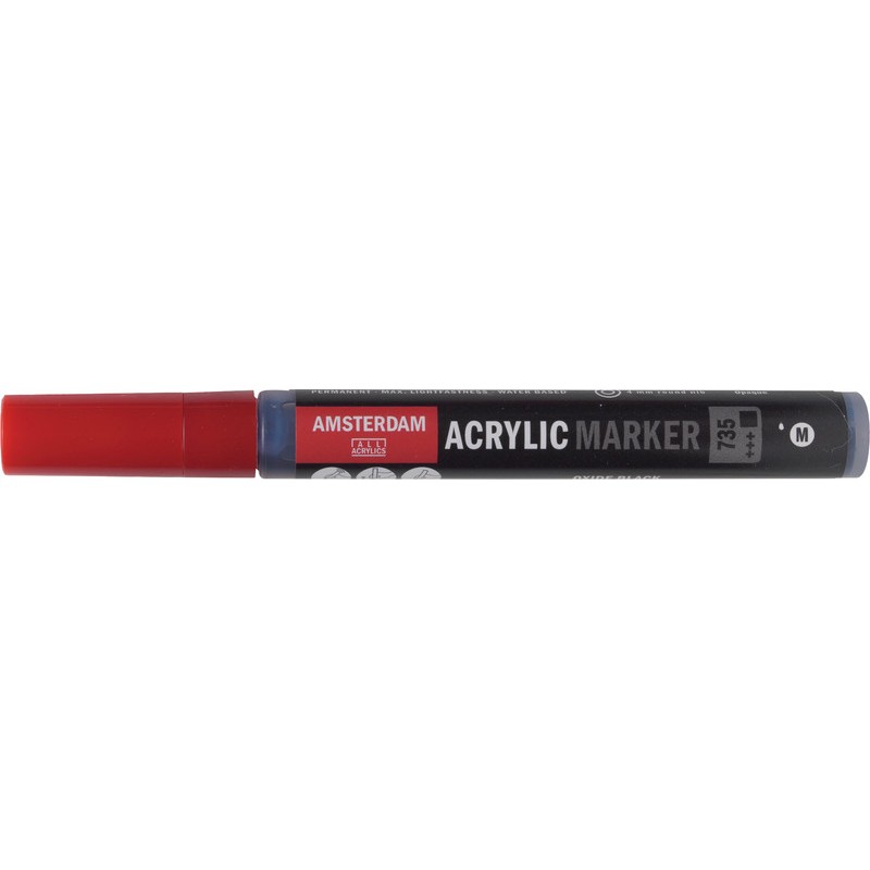 Marqueur acrylique AMSTERDAM pointe ogive, couleur brillante à base d'eau, très grande résistance à la lumière, parfait pour esquisser, peindre ou écrire sur un grand nombre de supports acryliques, p. ex. sur les châssis entoilés, le bois ou la terre cuite, séchage rapide, résistant à l'eau après séchage, non rechargeable, largeur de trait env. 4 mm.