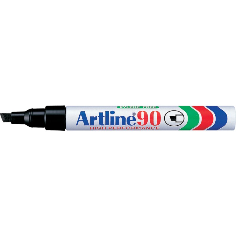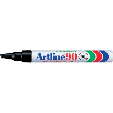 Marqueur permanent ARTLINE® 90 pointe biseautée, corps en aluminium, pour le marquage sur carton, verre, porcelaine, métal, plastique, caoutchouc et bois, résiste à l'abrasion et à l'eau, sans xylène, rechargeable, largeur de trait 2 - 5 mm.