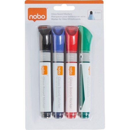 Marqueurs pour tableaux en verre NOBO® pointe ogive avec système de réencrage, effaçables à sec, non rechargeables, largeur de trait 3 mm. Etui de 4 pièces.