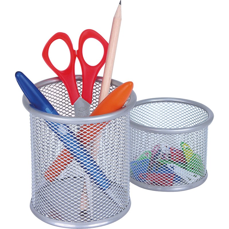 Pot à crayons WEDO® Office en fil métallique, set de 2 pièces. Dimensions: grand H 85 mm, Ø 100 mm, petit H 70 mm, Ø 75 mm.