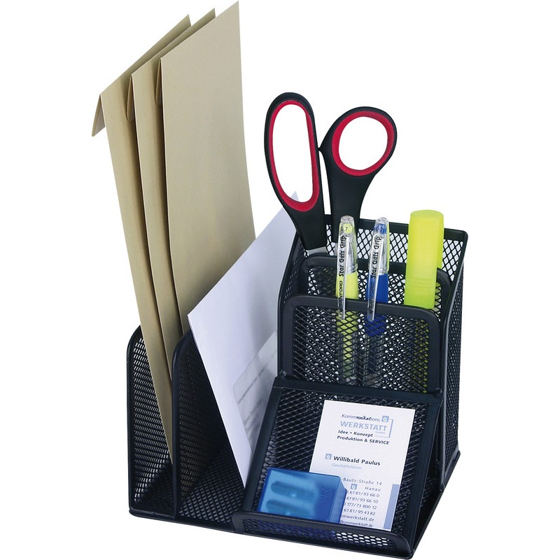 Multipot WEDO® Office en fil métallique, avec 4 compartiments, compartiment oblique. Dimensions: L 158 x H 135 x P 145 mm.