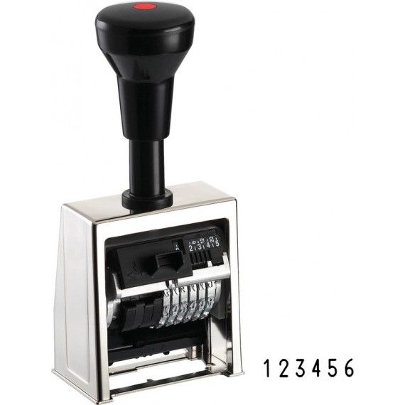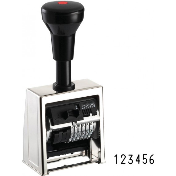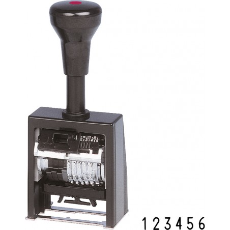 Numéroteur REINER® avec molettes de chiffres en alliage haute résistance et encrage automatique, 10000 - 20000 empreintes parfaites, livré avec coussin encreur noir et régleur. Bloc B 6 K avec 6 molettes de chiffres dont 5 à répétition automatique, avec ou sans zéros précédents. Avance du numérotage réglable: 0, 1, 2, 3, 4, 5, 6, 12, 20 fois le même numéro avant passage automatique au numéro suivant, monture en matière plastique.