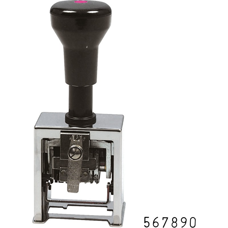 Numéroteur REINER® avec molettes de chiffres en alliage haute résistance et encrage automatique, 10000 - 20000 empreintes parfaites, livré avec coussin encreur noir et régleur. Bloc B 2 avec 6 molettes dont 4 à répétition automatique, avec zéros rentrants. Répétition des numéros: 0, 1, 2, 3, 4 fois le même numéro avant passage automatique au numéro suivant.