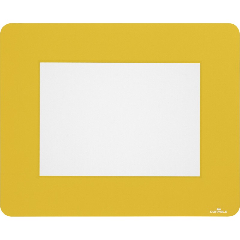 Autocollants d'information fenêtre pour le marquage au sol DURABLE en PVC, autocollants, adhésif amovible, pour les applications en intérieur telles qu'entrepôts, centres de distribution, production, hôtels, restaurants, etc., pour l'identification des zones et le signalement avec des notices en papier, à placer sous la pochette d'étiquetage; le papier reste protégé par l'adhésif tout autour, couleur RAL 1003 jaune de sécurité, utilisable au format portrait ou paysage, pour format A5. Emballage de 10 pièces. fenêtres 314 x 0,4 x 252 mm