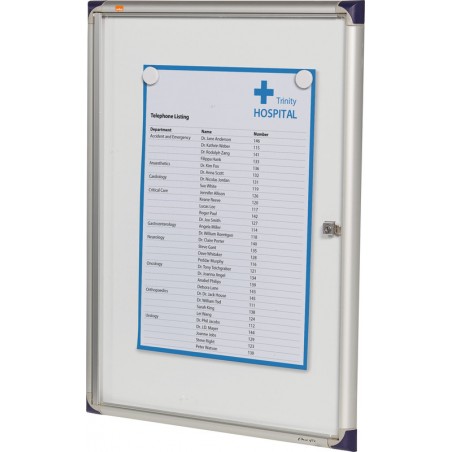 Vitrine pour utilisation à l'intérieur NOBO® Premium Plus extraplate vitrine verrouillable pour zone intérieure avec cadre en aluminium, serrure de sécurité à 2 clés, conception ultraplate pour une utilisation dans les couloirs ou en espace restreint, porte rabattable en verre acrylique pour une bonne visibilité avec un poids réduit, panneau arrière métallique magnétique, possibilité d'écrire au marqueur effaçable à sec, profondeur intérieure utile 11 mm, kit de fixation murale inclus. Garantie: 5 ans.
