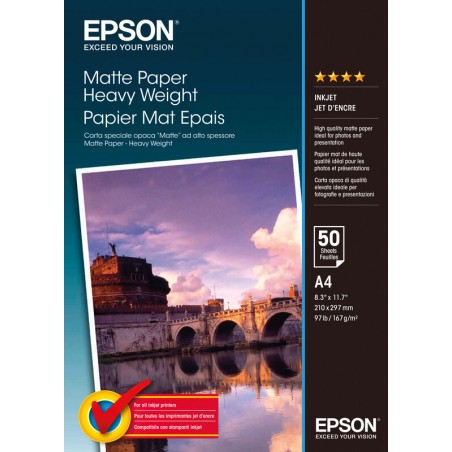 Papier photo jet d'encre EPSON® heavyweight, mat utilisable jusqu'à 1440 ppp, pour qualité photographique sur surface mate. Idéal pour les imprimantes Epson Stylus. Emballage de 50 feuilles.