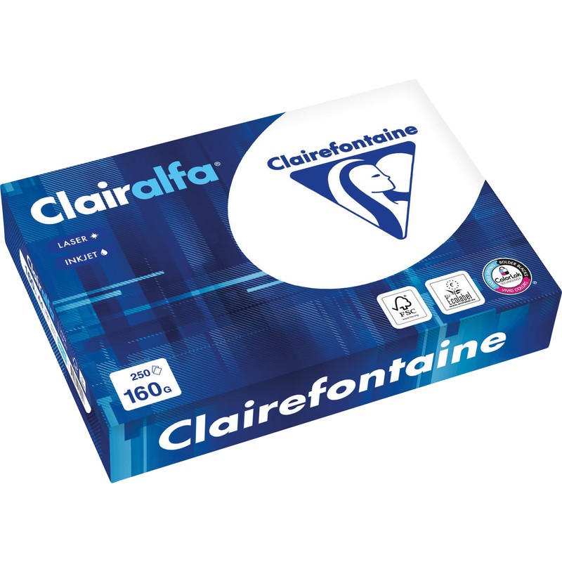 Papier universel CLAIREFONTAINE Clairalfa Premium, extra-blanc répond aux plus hautes exigences, sans chlore élémentaire. Degré de blancheur: 171 CIE. Pour copieurs, imprimantes laser, jet d'encre, laser couleur et copieurs couleur. Durabilité eco:plus: dégradable, recyclable. Certification: FSC, EU Ecolabel. emballage de 250 feuilles