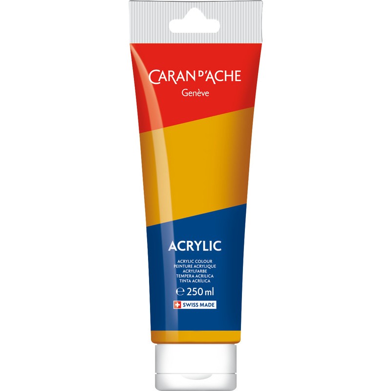 CARAN D'ACHE Acrylic couleurs acryliques lumineuses, ne craquellent pas, ne changent et ne se matifient pas après séchage, résistantes à la lumière, miscibles à l'eau, forte concentration pigmentaire, pour les surfaces lisses et texturées telles que la toile, tissus, papier, carton, verre, plastique, métal, bois, etc., s'appliquent au pinceau ou à la spatule. Tube de 250 ml.