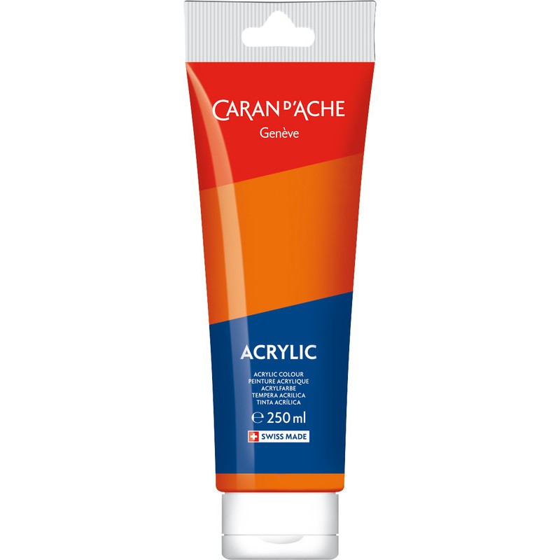 CARAN D'ACHE Acrylic couleurs acryliques lumineuses, ne craquellent pas, ne changent et ne se matifient pas après séchage, résistantes à la lumière, miscibles à l'eau, forte concentration pigmentaire, pour les surfaces lisses et texturées telles que la toile, tissus, papier, carton, verre, plastique, métal, bois, etc., s'appliquent au pinceau ou à la spatule. Tube de 250 ml.