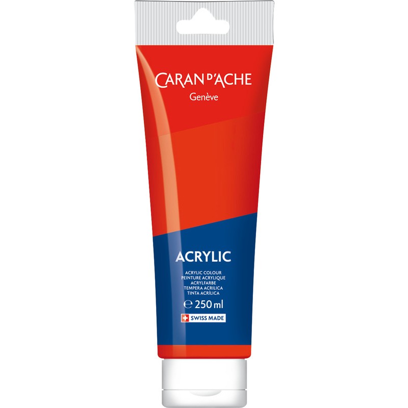 CARAN D'ACHE Acrylic couleurs acryliques lumineuses, ne craquellent pas, ne changent et ne se matifient pas après séchage, résistantes à la lumière, miscibles à l'eau, forte concentration pigmentaire, pour les surfaces lisses et texturées telles que la toile, tissus, papier, carton, verre, plastique, métal, bois, etc., s'appliquent au pinceau ou à la spatule. Tube de 250 ml.