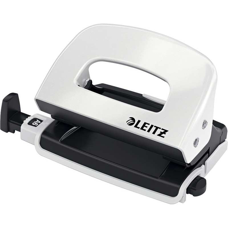 Perforateur (en métal) LEITZ® série NeXXt 5060 WOW mini partie inférieure et poignée en métal robuste, pour écartement 8 cm, perforation Ø 5,5 mm, réglette avec indications du format facilement lisibles et fenêtre de visualisation du format réglé en couleur, poinçons extrêmement bien affûtés, zone de préhension ergonomique (sans prémoulage) pour une perforation confortable, capacité de perforation 1 mm (10 feuilles). Garantie: 10 ans. Certification: GS.