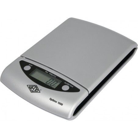 Balance WEDO® Optimo 1000 en ABS résistant,argent, une touche pour toutes les fonctions: on/off/tare, arrêt automatique après env.1 min, écran de visualisation LCD, graduation: 0,5 kg jusqu'à 1 kg, alimentation par 2 piles AAA Micro 1,5 V (fournies). Dimensions: L 203 x H 133 x P 34 mm. Garantie: 3 ans. Prix incluant la TAR.