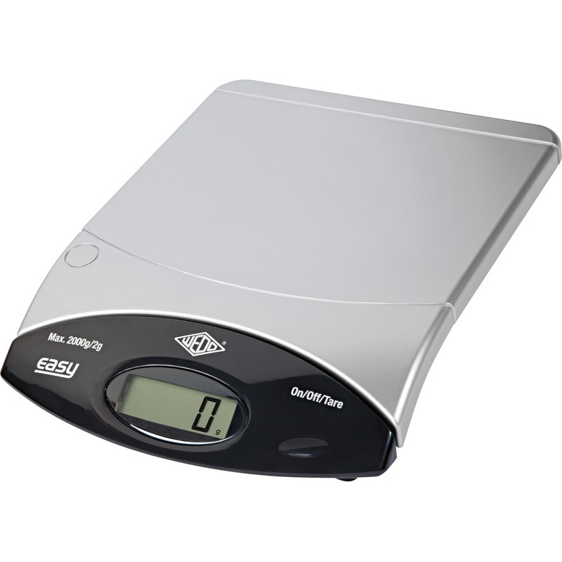 Balance WEDO® Easy 2000 boîtier en ABS de couleur argent mat et noir brillant, fonction de tare, écran LCD, hauteur des chiffres 13 mm, alimentation par 2 piles AAA Micro 1,5 V (fournies), arrêt automatique après env. 1 min, graduation: 2 g jusqu'à 2000 g. Dimensions: L 207 x H 41 x P 160 mm, plateau: L 160 x P 157 mm. Garantie: 3 ans. Prix incluant la TAR.