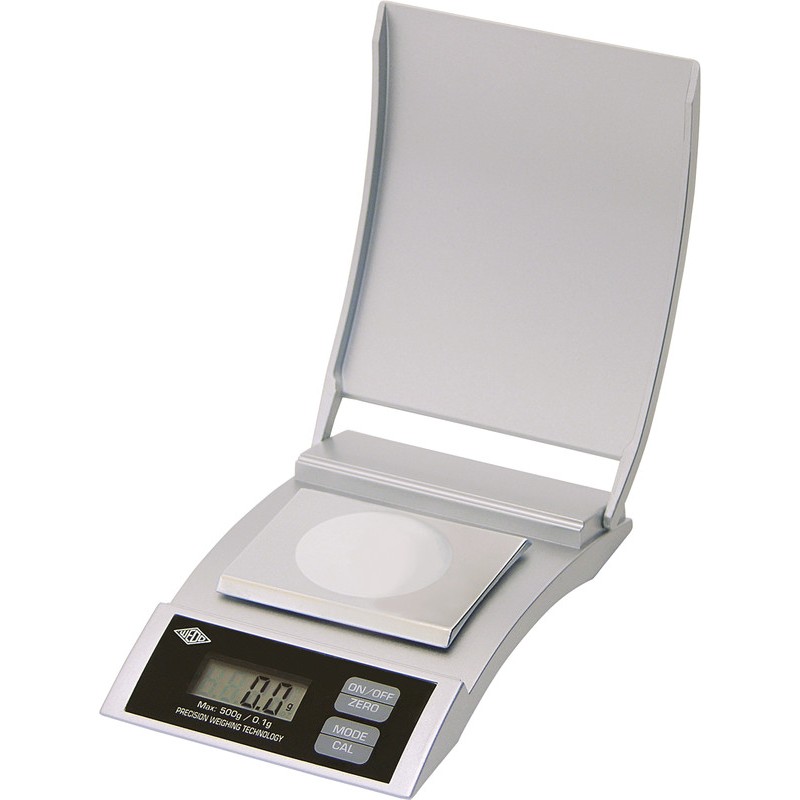 Balance WEDO® Precision 500 petite balance de précision de poche (seulement 115 g avec la pile), graduation 0,1 g, technique de pesée sensorielle, fonction tare et calibrage utilisateur, couvercle de protection rabattable, plateau de pesée avec creux, fonctionnement à pile (1 pile Mignon AA 1,5 V fournie), arrêt automatique après 30 sec. Dimensions: L 86 x H 20 x P 126 mm, plateau: L 62 x P 43 mm. Poids: 115 g. Garantie: 3 ans. Prix incluant la TAR.