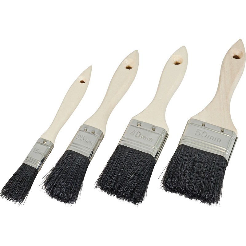 Set de pinceaux brosses GEISTLICH pointe de soies naturelles noires, plat, manche en bois non traité, virole en aluminium, pour les travaux de peinture, de laquage et de lessivage, pour les peintures à base de solvant, peintures synthétiques, peintures à l'huile, les dispersions, les lessivages, etc., tailles et longueurs assorties. Set de 1 pinceau par largeur, largeurs 15, 25, 40 et 50 mm.