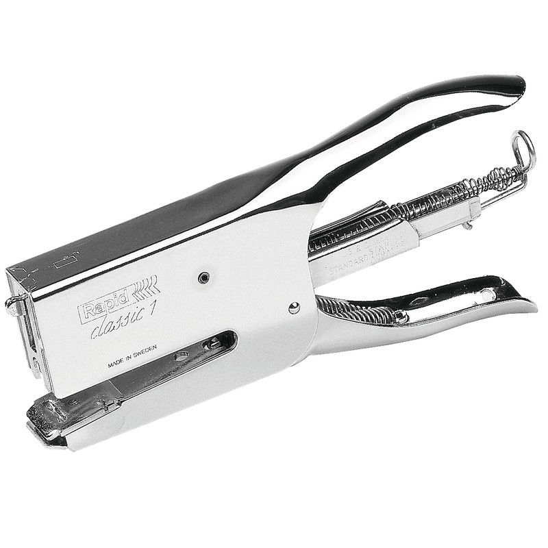 Pince à agrafer RAPID® K1 en métal, avec mécanisme de chargement arrière, pour agrafage fermé ou ouvert, capacité d'agrafage env. 5 mm (50 feuilles), profondeur d'engagement 56 mm. Agrafes: 24/6 strong et 24/8+ super strong. Garantie: 5 ans si utilisée avec des agrafes RAPID®.