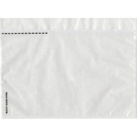 Enveloppes-pochettes ELCO Quick Vitro sans impression transparentes ne sont pas conformes aux spécifications de la Poste, avec perforation d'arrachage, pochette transparente. Adaptées aux enveloppes, dos, rabat et languette de fermeture autoadhésifs, en PE non nocif pour l'environnement, exemptes de produits toxiques. Boîte de 250 pièces.